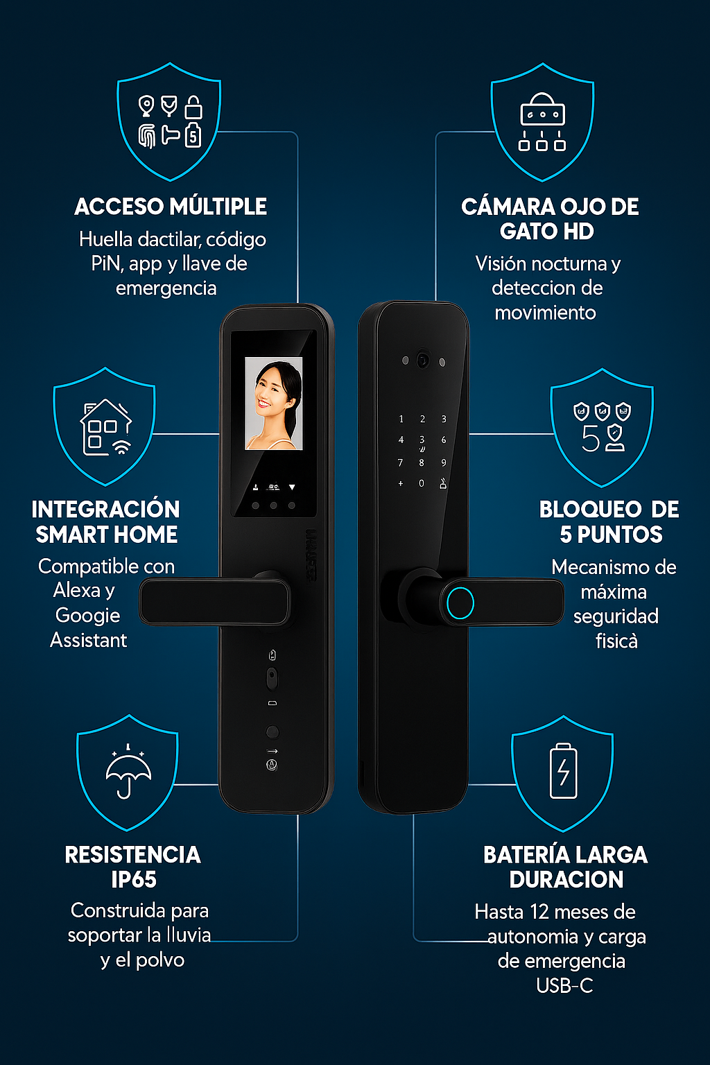Esta cerradura representa la evolución definitiva en seguridad doméstica. Combina la robustez de una cerradura tradicional con la inteligencia de un sistema de seguridad completo. Su diseño específico para puertas de madera garantiza instalación perfecta sin comprometer la estructura.