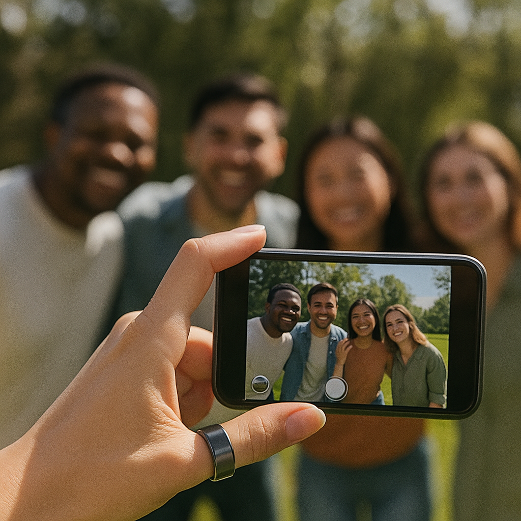 📸 Disparador Remoto para Fotos ¿Eres amante de la fotografía? Usa tu anillo como un control remoto discreto para la cámara de tu teléfono. Captura selfies, fotos grupales y tomas creativas sin necesidad de un temporizador o de tocar la pantalla.
