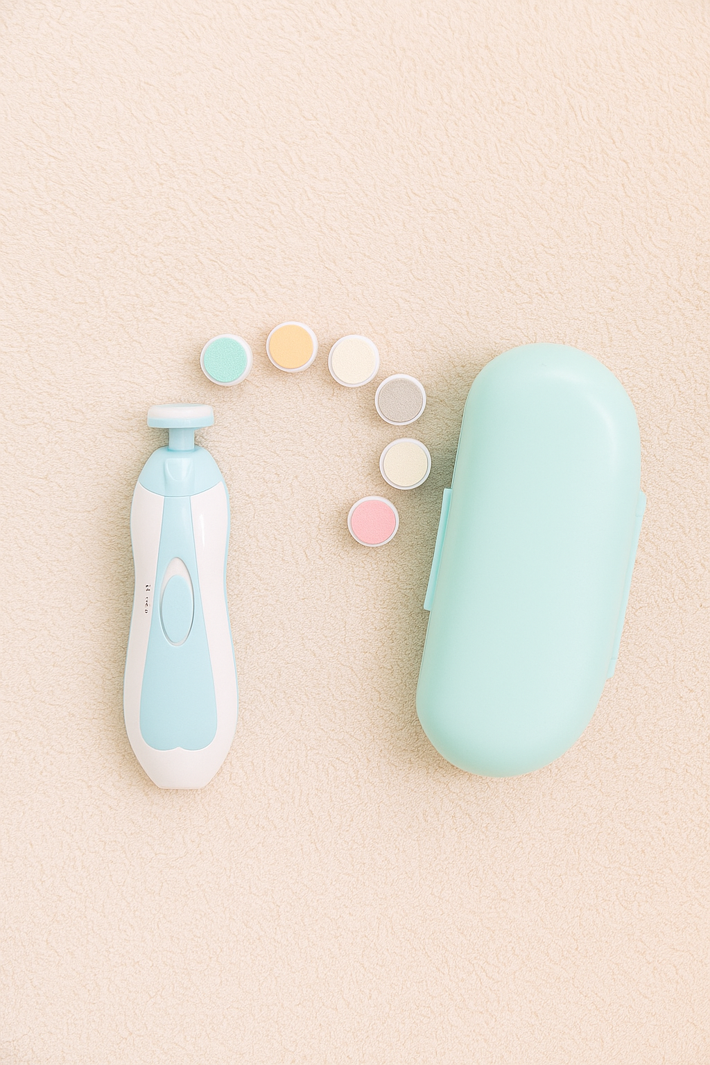👨👩👧 Un Kit que Crece con tu Familia Este no es un producto que usarás solo por unos meses. Viene con 6 cabezales intercambiables: 3 almohadillas de limado ultra-suaves para las diferentes etapas de tu bebé (recién nacido, infante, niño) y 3 herramientas para que mamá y papá también puedan usarlo para su propio cuidado. ¡Un solo kit para todos!