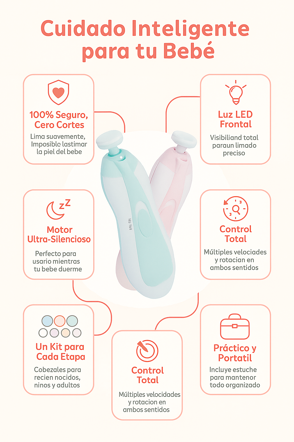 ✅ Elimina el Estrés y la Ansiedad de los padres al cortar las uñas. ✅ 100% Seguro para el Bebé: Cero riesgo de cortes, sangre o lágrimas. ✅ Silencioso y Suave: No asusta al bebé y permite usarlo mientras duerme. ✅ Crece con tu Hijo: Diferentes cabezales para cada etapa de su crecimiento. ✅ Solución Completa: Un solo kit para el cuidado de las uñas de toda la familia.
