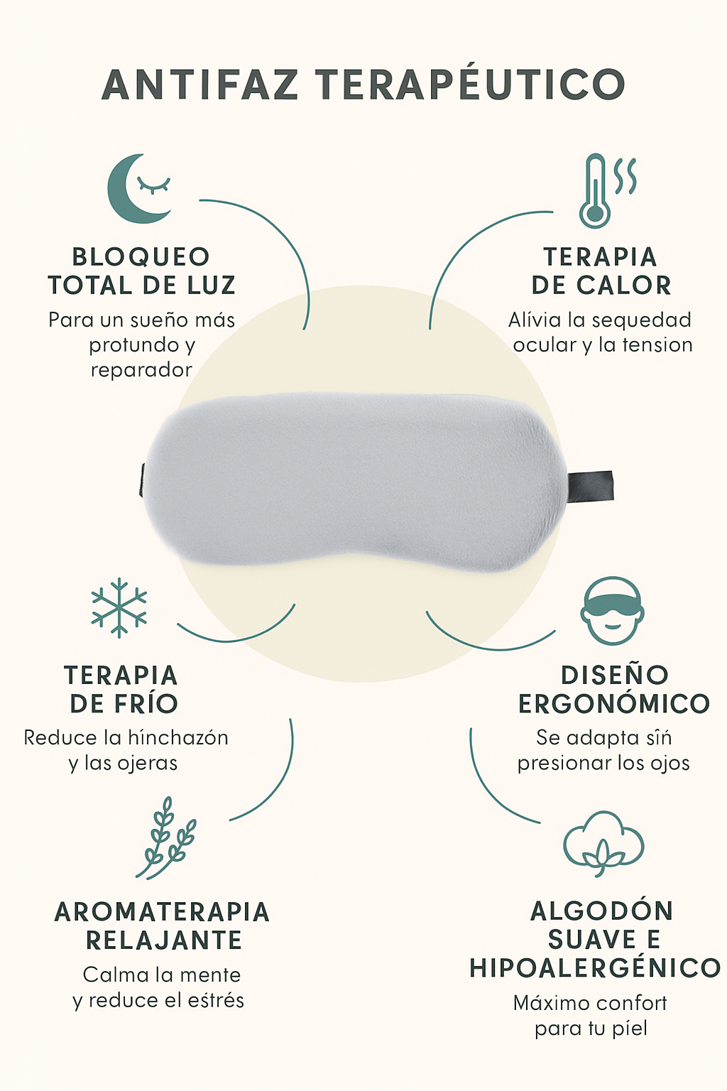 En un mundo dominado por las pantallas, nuestros ojos pagan el precio: fatiga, sequedad y una constante dificultad para desconectar. Imagina poder cerrar los ojos y sentir una oscuridad total mientras una suave terapia de calor o frío alivia toda esa tensión acumulada. Te presentamos el Antifaz Terapéutico para Ojos, una solución innovadora para el descanso y la recuperación ocular. No es un simple antifaz para dormir; es tu spa personal portátil, diseñado para bloquear la luz, calmar la fatiga y transportarte a un estado de relajación profunda en cuestión de minutos.