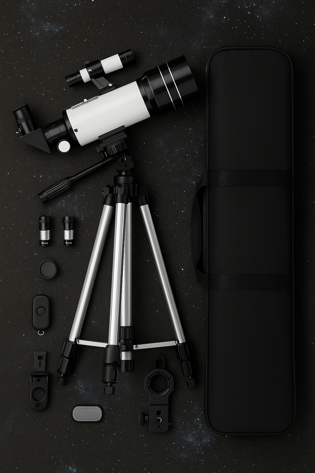 Paquete Iniciación Estelar: Perfecto para dar los primeros pasos. Incluye el telescopio de alto rendimiento, trípode estable, buscador y los oculares esenciales para comenzar.