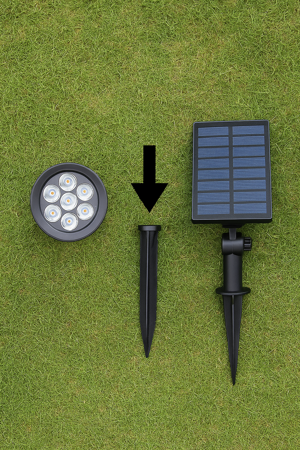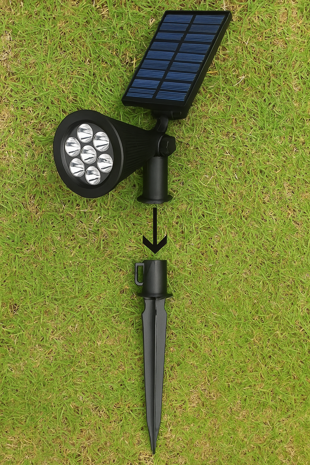 Clavar: Elige un lugar soleado en tu jardín y clava la estaca firmemente en la tierra. ¡Así de fácil, sin herramientas ni cables!